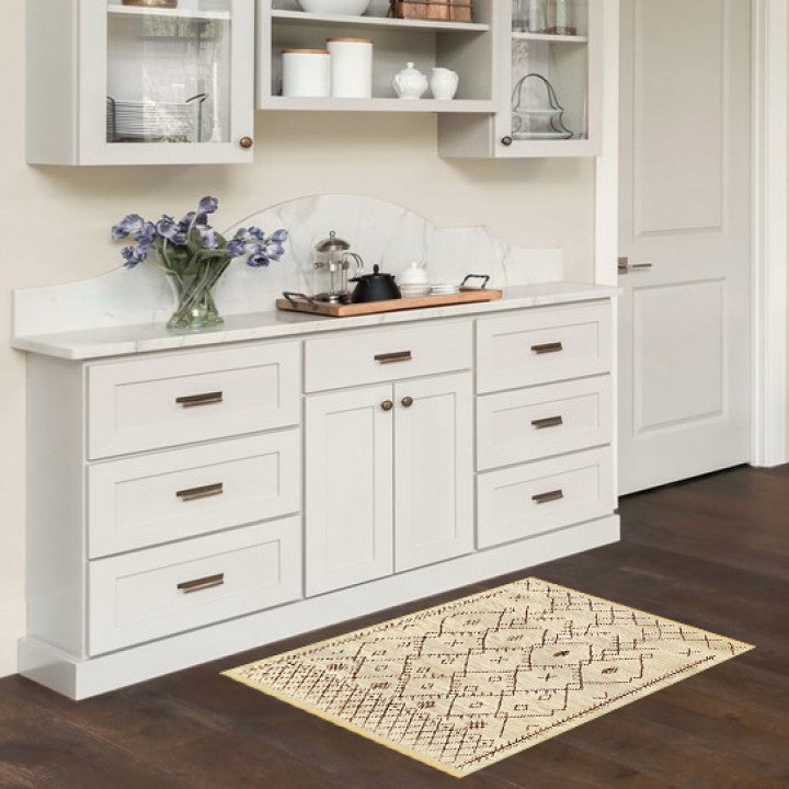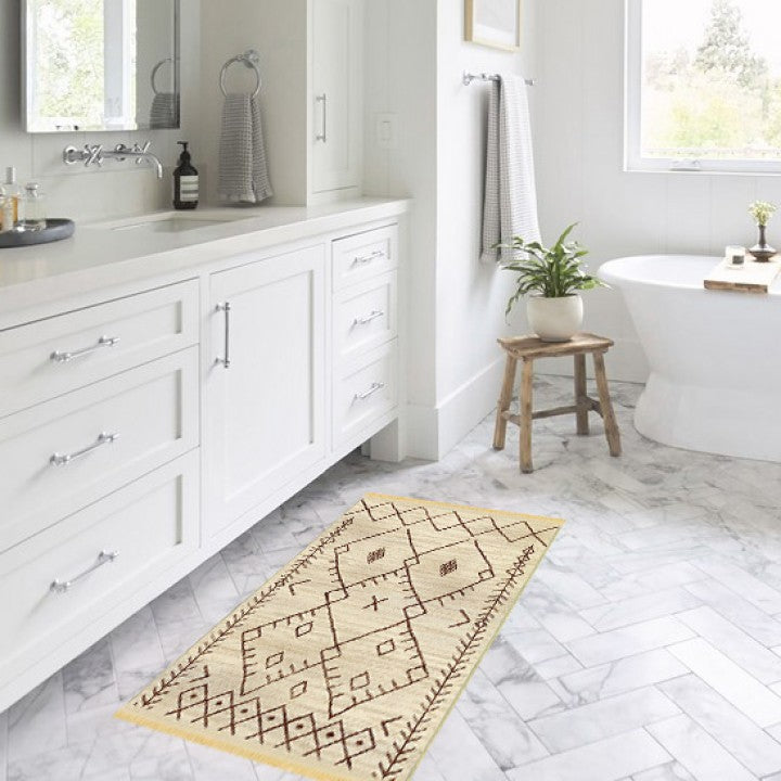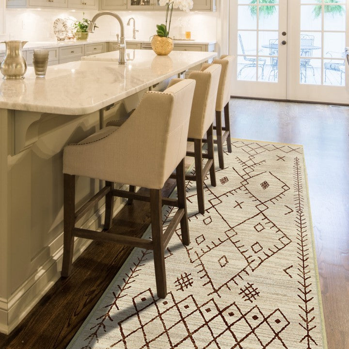 Descubre la elegancia y el encanto de nuestra alfombra "Stella". Con un patrón intrincado de rombos y líneas entrelazadas en tonos marrones sobre un fondo beige, esta alfombra no solo aporta calidez y confort a cualquier espacio, sino que también añade un toque de sofisticación y estilo bohemio. Ideal para salas de estar, dormitorios o cualquier rincón que necesite un toque de distinción, esta alfombra es la combinación perfecta de tradición y modernidad. ¡Transforma tu hogar con esta pieza única y llena de carácter! Lavable en lavadora, base antideslizante, sin pelusas e hipoalergénica.