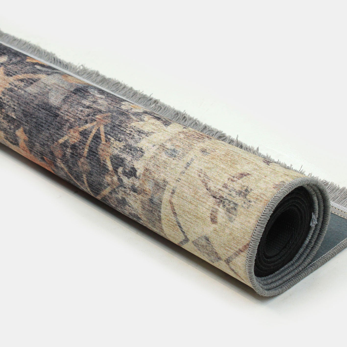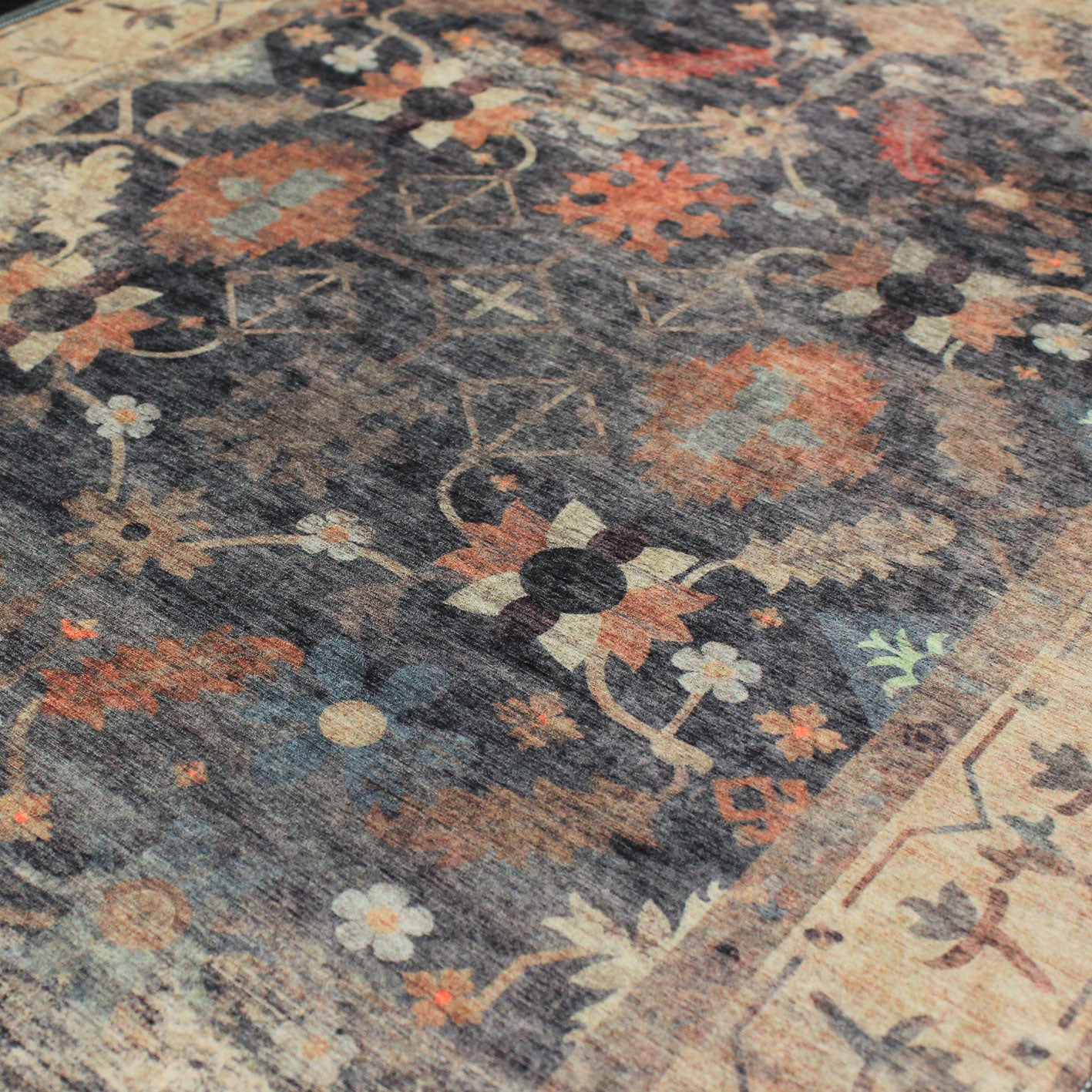 Vintage con un toque bohemio. Nuestra alfombra Alba combina un patrón floral y geométrico en tonos de gris ahumado y beige suave, acentuado por detalles en rojo óxido y terracota. El efecto desgastado le aporta un encanto rústico y atemporal, ideal para darle a tu espacio un aire cálido y acogedor.
