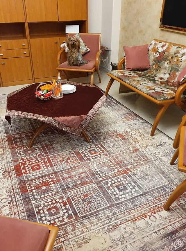 Transforma tu hogar con la sofisticación y el encanto atemporal de nuestra alfombra "Twilight" de diseño vintage. Con un intrincado patrón de motivos geométricos y florales en tonos cálidos de rojo, beige y gris, esta pieza no solo embellece tu espacio, sino que también cuenta una historia. Su aspecto envejecido añade carácter y un toque de elegancia clásica que complementa cualquier decoración. Ideal para aquellos que buscan una mezcla perfecta de tradición y estilo contemporáneo, nuestra alfombra es la elección definitiva para un hogar lleno de historia y belleza. ¡Hazla tuya y deja que cada paso cuente una nueva historia! Lavable en lavadora, base antideslizante, sin pelusas e hipoalergénica.