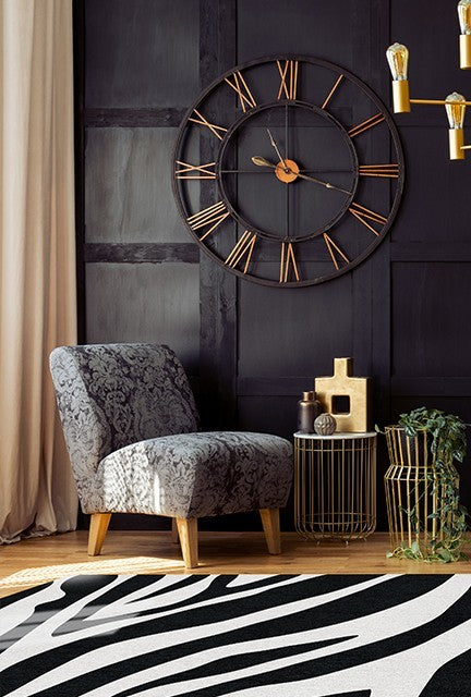 La alfombra "Zebra" presenta un diseño audaz con un patrón de rayas negras y blancas que imita el pelaje natural de una cebra. Este diseño gráfico y llamativo es ideal para quienes buscan una decoración atrevida o un tema animal en su espacio. La combinación de colores neutros y el patrón distintivo hacen que esta alfombra sea una pieza versátil y llamativa para cualquier estilo decorativo.