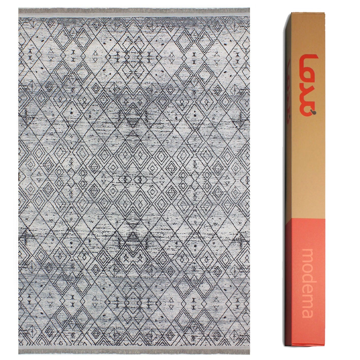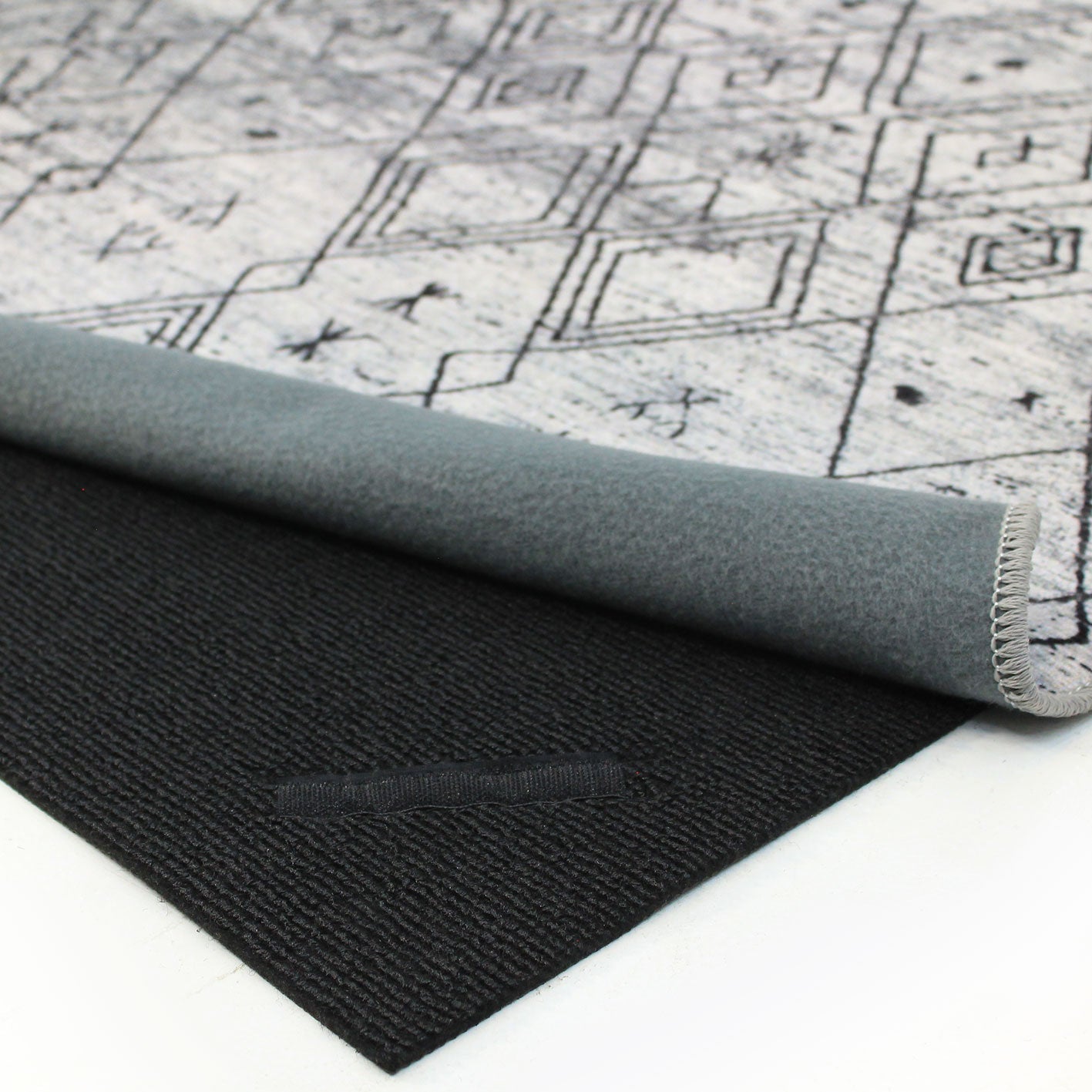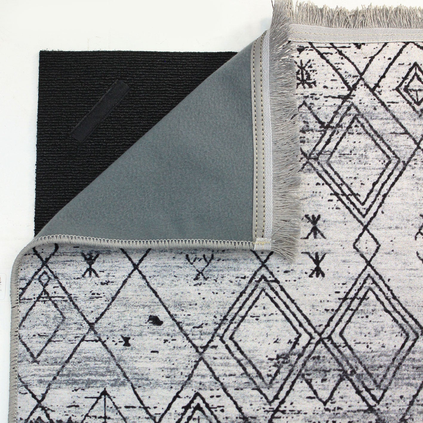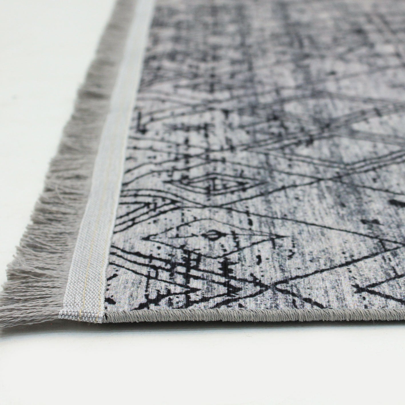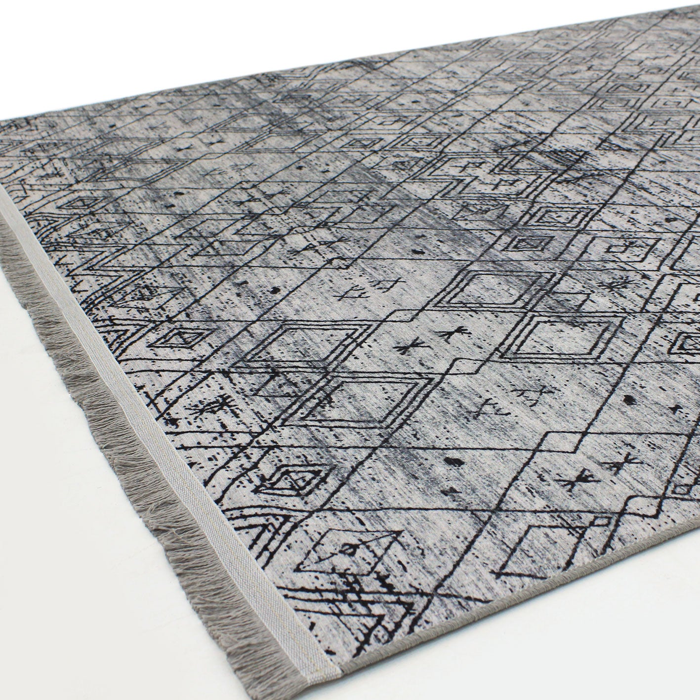 Nuestra alfombra "Anissa" con su diseño geométrico en tonos grises y negros, con patrones de rombos y detalles intrincados que le dan un aire moderno y sofisticado. Su acabado sutilmente desgastado añade un toque vintage, perfecto para complementar ambientes contemporáneos y elegantes.